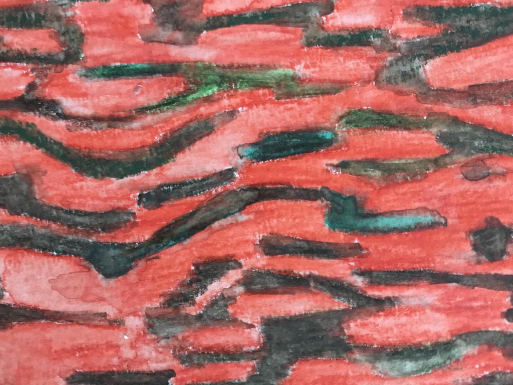 Scarlet … I don’t have a cool red tubepaint, or watercolor crayon. Had to dig out some old aquarelle pencils. This is an experimental animal-look pattern that might work for a shaman’s cloak.