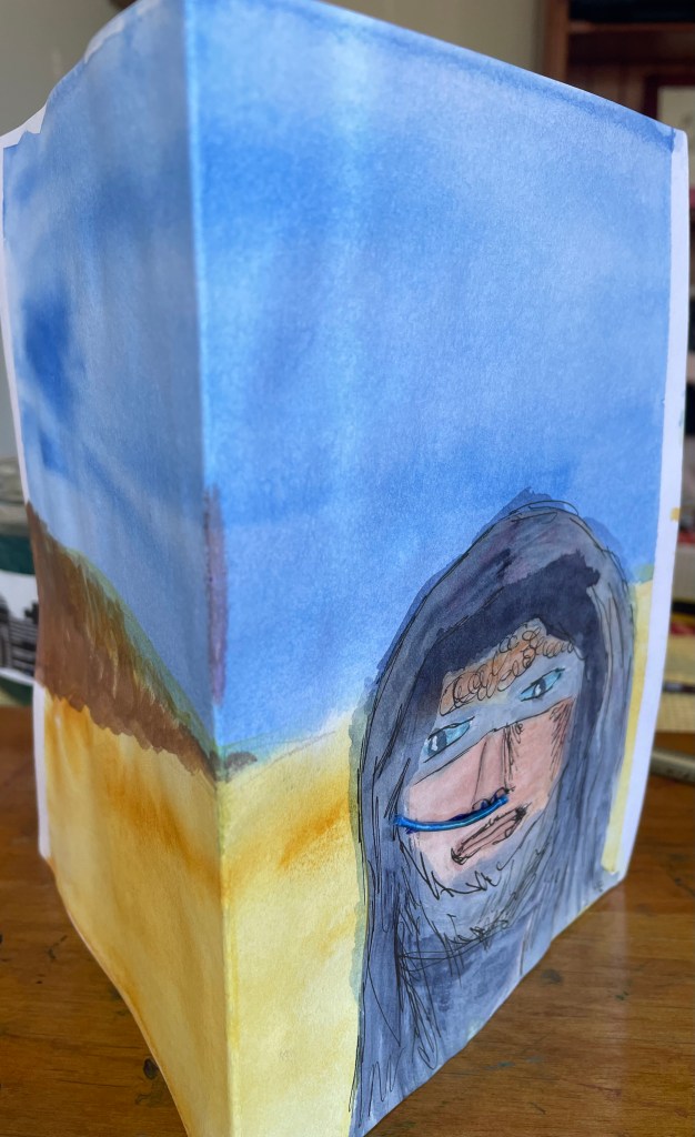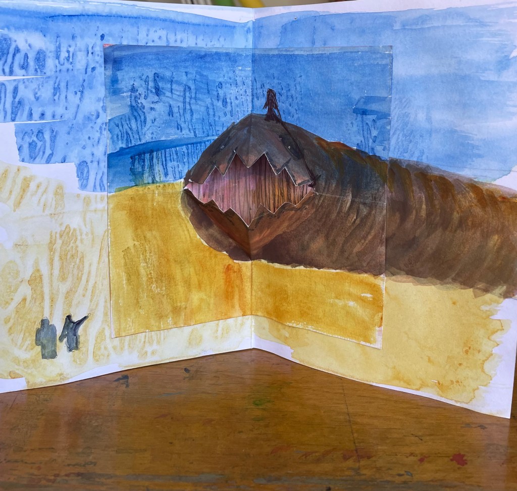 Decided to paint him a birthday card as a teaser, and whispered a promise to our four-year-old descendant–in a fit of over-the-top confidence–to make it a ‘pop-out scary-monster’ card.