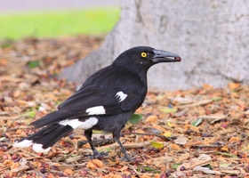 There’s another sort of black-and-white bird around, as well. They have red-brown eyes and grey-white beaks, and aren’t as big or fierce. They’re Australian magpies. One of them comes into the yard to listen for worms traveling underground. When it hears one, it pokes its beak into the grass to catch them.