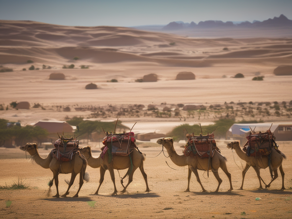 My prompt as follows … A camp of camel herders with tents and camels standing around, the surrounding countryside has corn growing, and a massive plateau rises in the background.