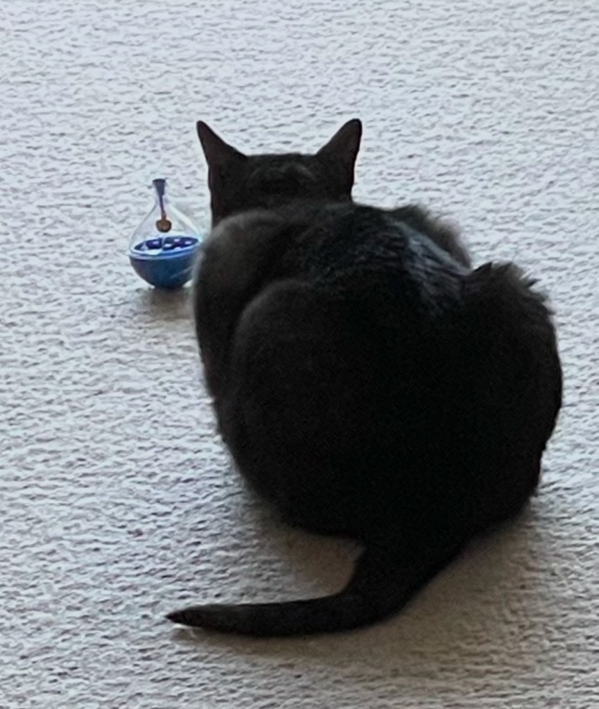 She’s wising up to me, though. she’s letting me starve, not reacting to any of my hints about getting more kibbles out. Soon I will have to ‘engage’ either with the blue top or with the castle.