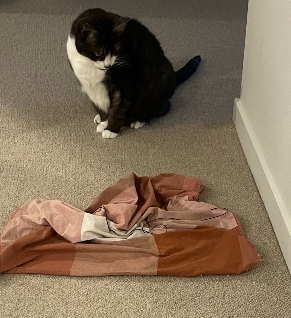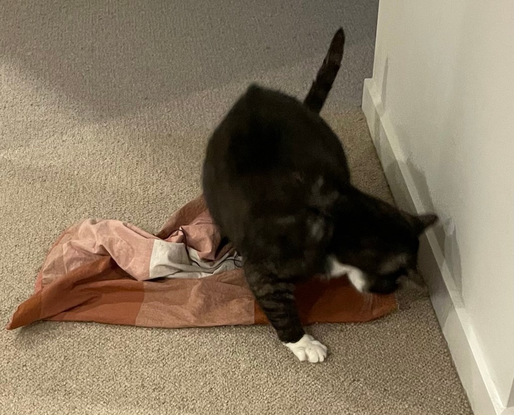 When she started typing, the one-fingered type, I came back and am just sitting here looking at my black string. Hoping it’ll magically start moving itself so I can chase it.