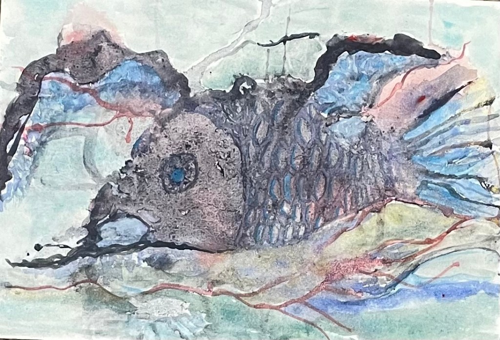 Second, this fish. I call it a bottom feeder, but may rename it … I’m having so much trouble getting this from my mobile … might have to do magic. Like, abracadabra … OK I’ve got it. Ended up saving it to the desktop … isn’t she beautiful? A spatter and spray painting barely touched up. Well, OK, I painted the scales. The rest is dabbed. Not yet sealed.