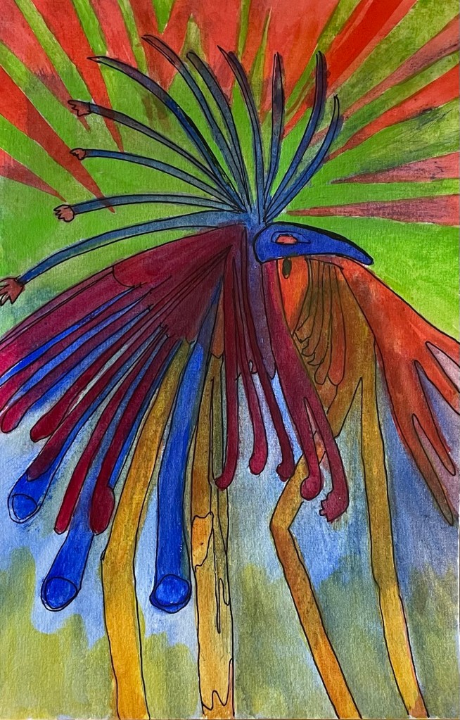It’s hard to believe what you can get from spattering paint onto the paper then spraying it with water. But that’s only the first layer. You let it dry, then the next day, if the pattern you have doesn’t yet suggest anything to you, you do it again. Like I did with this one. The third day, this aviatrix lay there waiting for me. I painted some of the areas to increase that likeness and here she is.