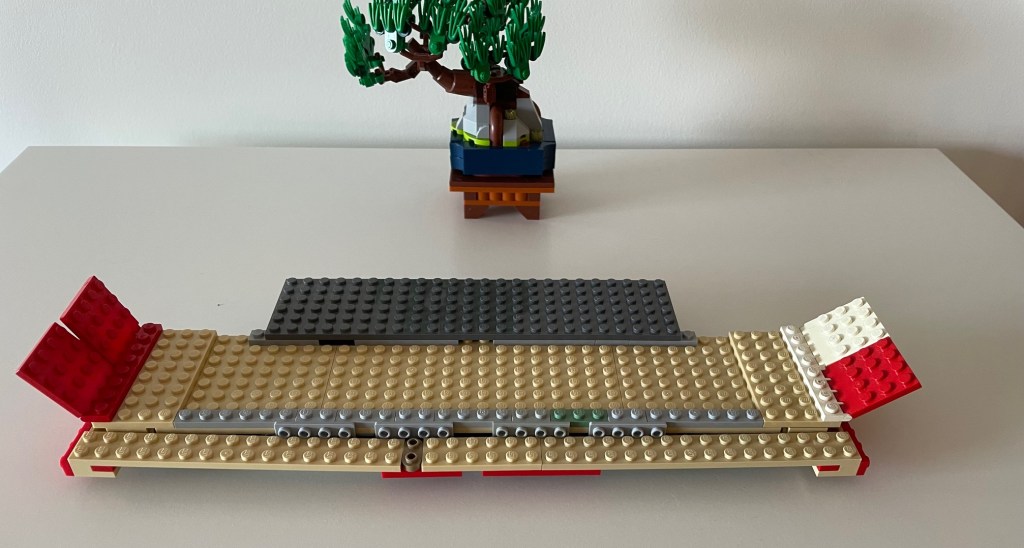 This is the first time I’ve come to grips with Studs Not On Top (SNOT) bricks and angled plates in one of My Own Creations (moc). The problem here was the two hulls needing to be used upside down and connected to the deck plates which of course are set studs up.