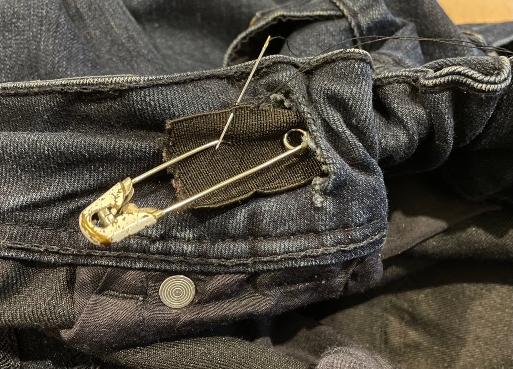This little repair, for instance, does anybody ever replace tired elastic in jeans, pyjamas, etc? And how, if not with the help of safety pins?