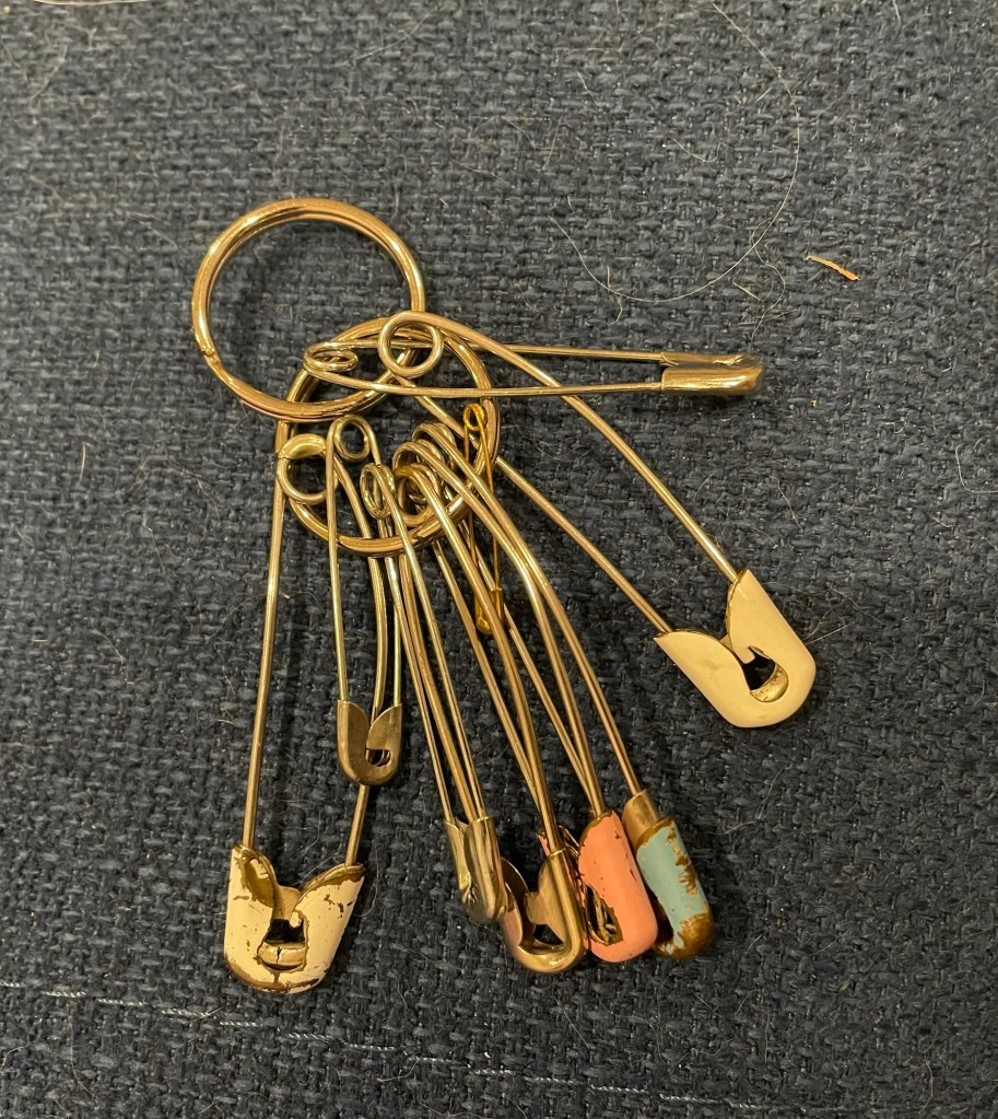That up there is my collection of old safety pins. At least three are forty years old from the time when it was my turn to pin nappies on a baby. These pins still going strong. I wouldn’t like to be without them.