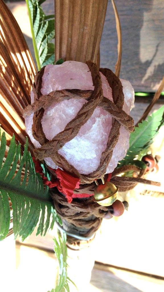 This crystal-topped staff hand-made by Alys Shilo (photo made in 2014) from various natural and machine-made objects, no plastic involved.