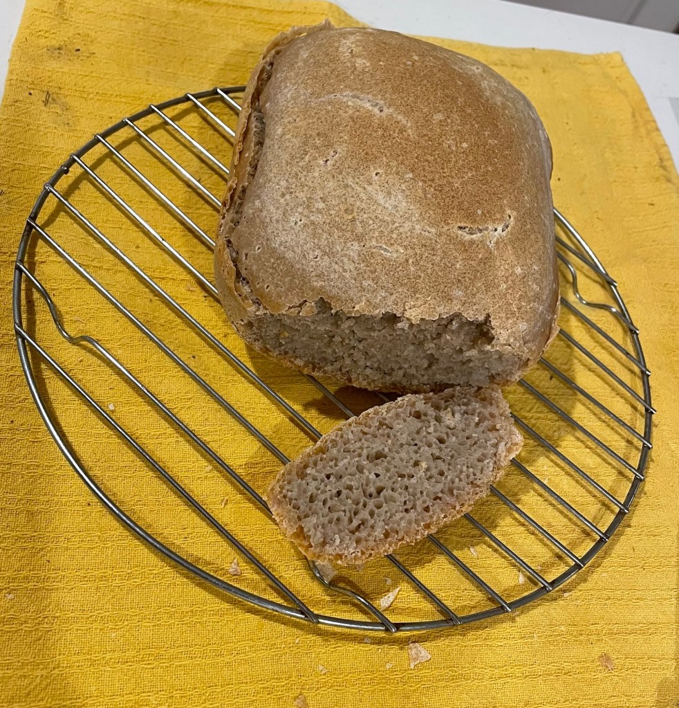 My second loaf. The inside looks somewhat grey, though the bread is very tasty.