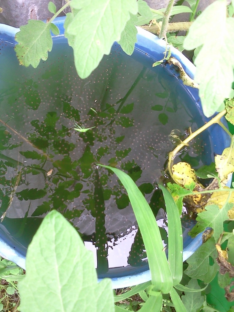 When the buckets were about half-full of rainwater, the pernickety old woman dipped her hand in the frog pond, scooped up a handful of azolla water weed and carried it dripping to the buckets and dripped a bit of the weed in each.