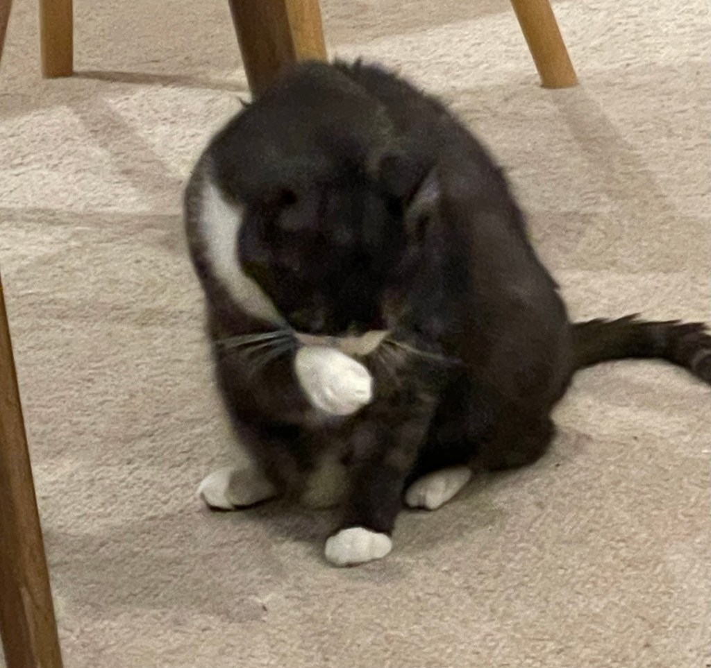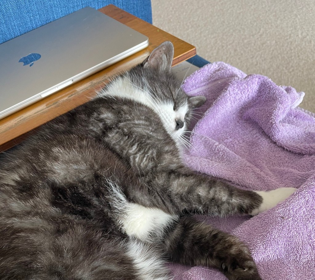My human came bleary-eyed from the bedroom. Dressed in her usual long pants, cotton shirt and kimono loose over the top. She yawned. “Let me put on a pot of tea first.”