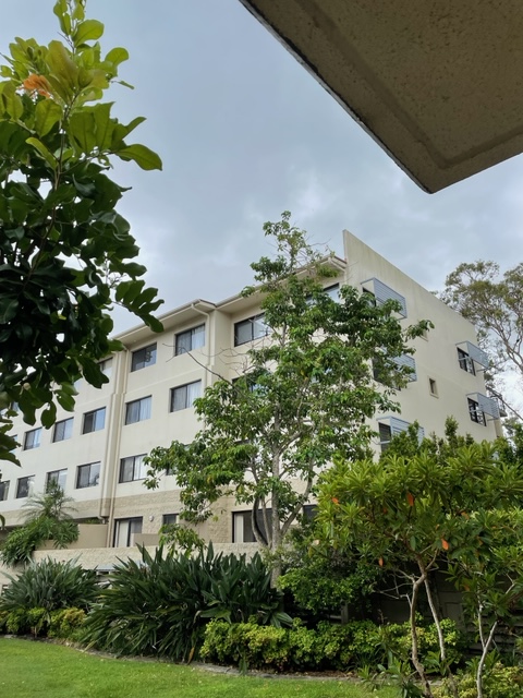 Nice place, isn’t it? Gardens, central swimming pool, blocky buildings from the 1980s. Birds, mostly rainbow lorikeets but also Torresian crows, chattering and whistling in the trees surrounding the central grassed area. The place is gated to keep out the riff-raff.