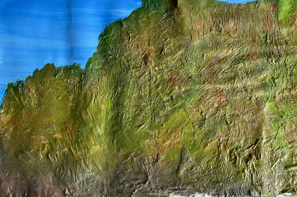 Could I tie the background together using a gesso glaze? Glaze too thick, blotted out the detail. Cat is sitting on a blue couch. Can’t really see that.