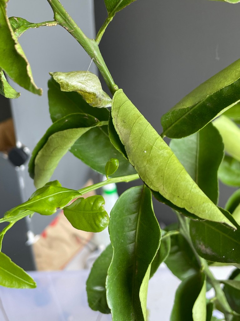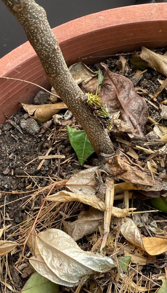 Just lucky I didn’t tidy the whole thing away, which I didn’t do because the leafy wild lemon branches donated at the last minute had on them a very young instar.