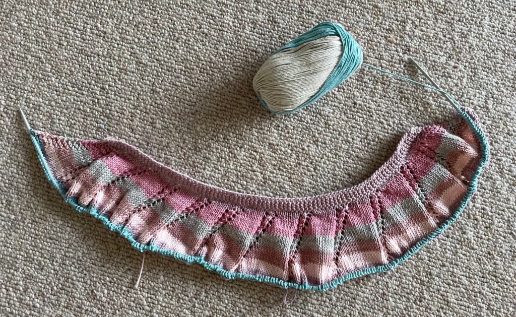 A shawlette is a medium-sized shawl, I’m assuming. I learned the term from JS. The deepest part will about 40 cms or 17 inches. The length … not sure yet … whatever it ends up being when I’ve reached the required depth.