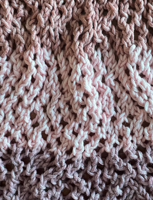 The yarn is Shadow 8 ply by Vera Moda, 60% cotton and 40% acrylic … one of those yarns you see marked down more than half its original price and you can’t resist buying. It’s very pleasant to knit.
