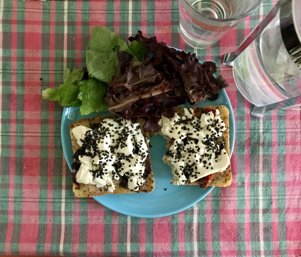 One of my successful low-FODMAP lunches … two pieces of GF toast, 2 pieces dried tomato and maybe a couple of half-olives, tofu, sprinkled with black sesame seeds. Lettuce for a green and water to drink