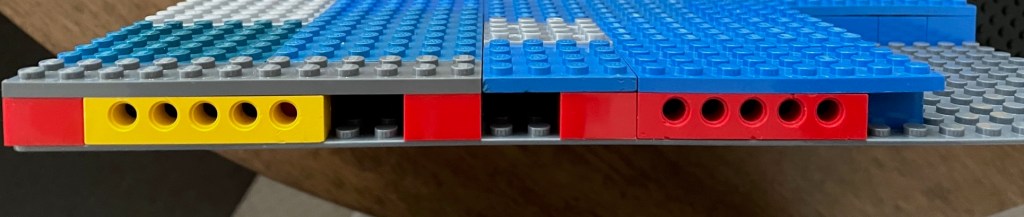 That up there is a thirty-two stud base plate stuck to the wall with five velcro-type fixings. Not ideal as I have already found, as all the places where there aren’t fixings are hard to press down on.