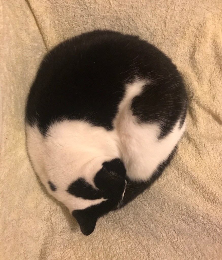 Me, Hand-of-God, sleeping in the contested red chair. On a towel because I shed black and white hair.