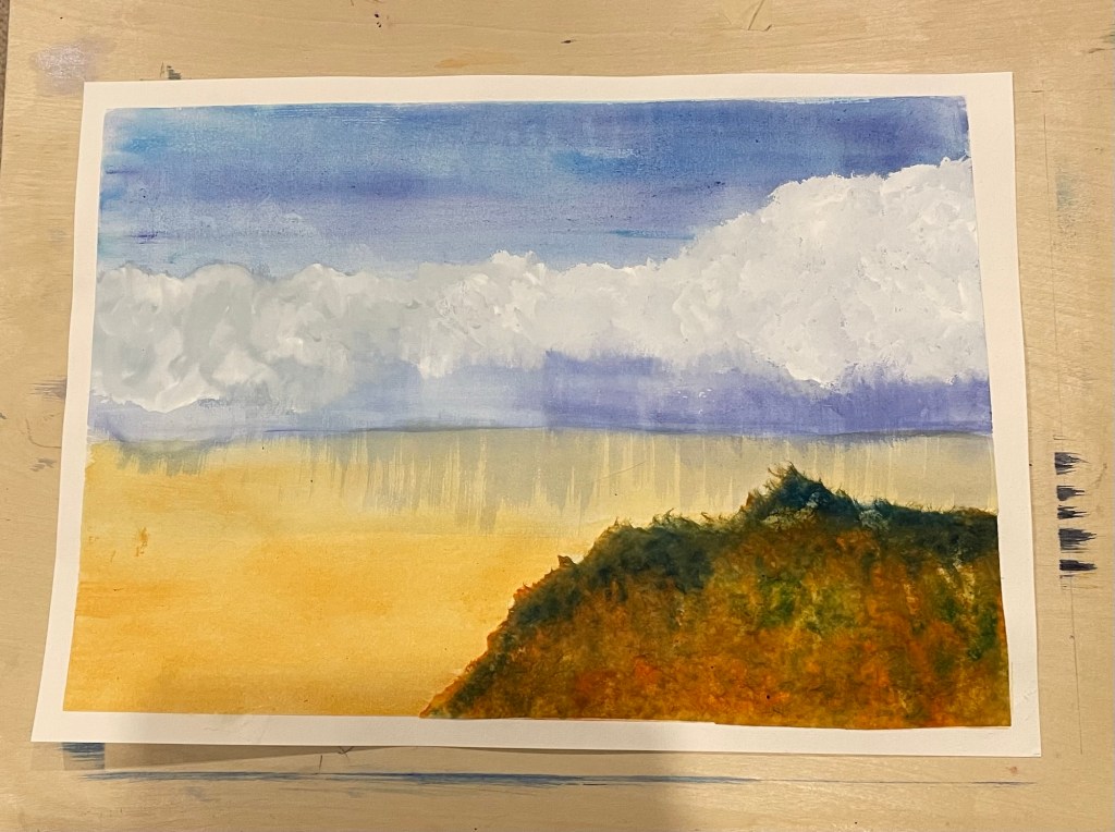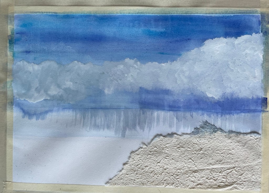 A mix of French Ultramarine and Phthalo blue for the sky, clouded with gouache white going into grey. The headland unadorned in situ weirdly looks inset, rather than glued on top.